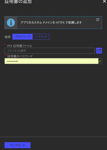SSLやらなんやらやってきましたが、最終章です。 tekitoumemo.hatenablog.com tekitoumemo.hatenablog.com tekitoumemo.hatenablog.comSSLやらドメインの取得をしたらAzure Portalへ移動します。まずはSSLの登録をしましょう。[SSL証明書]→[証明書のアップロ…